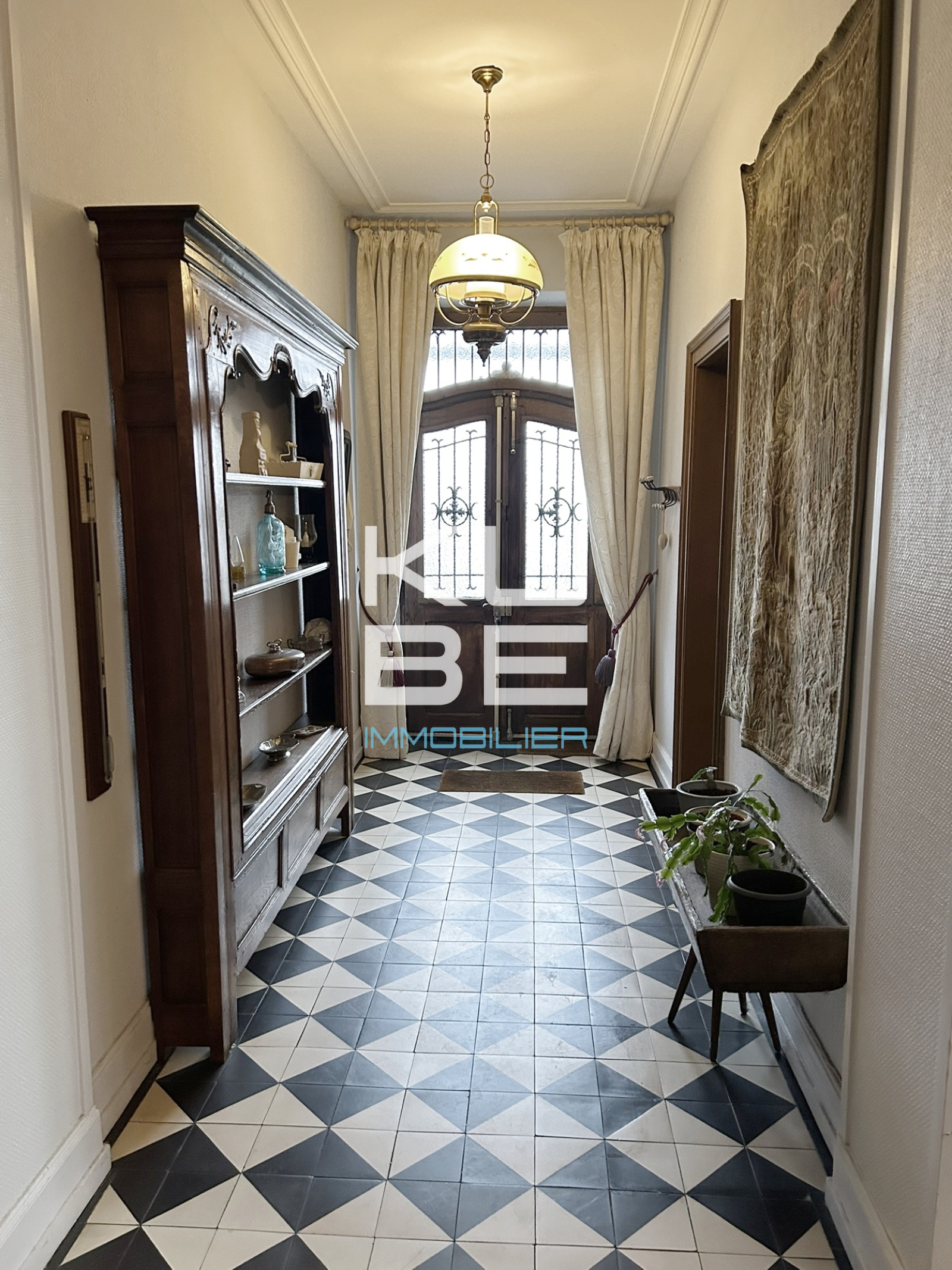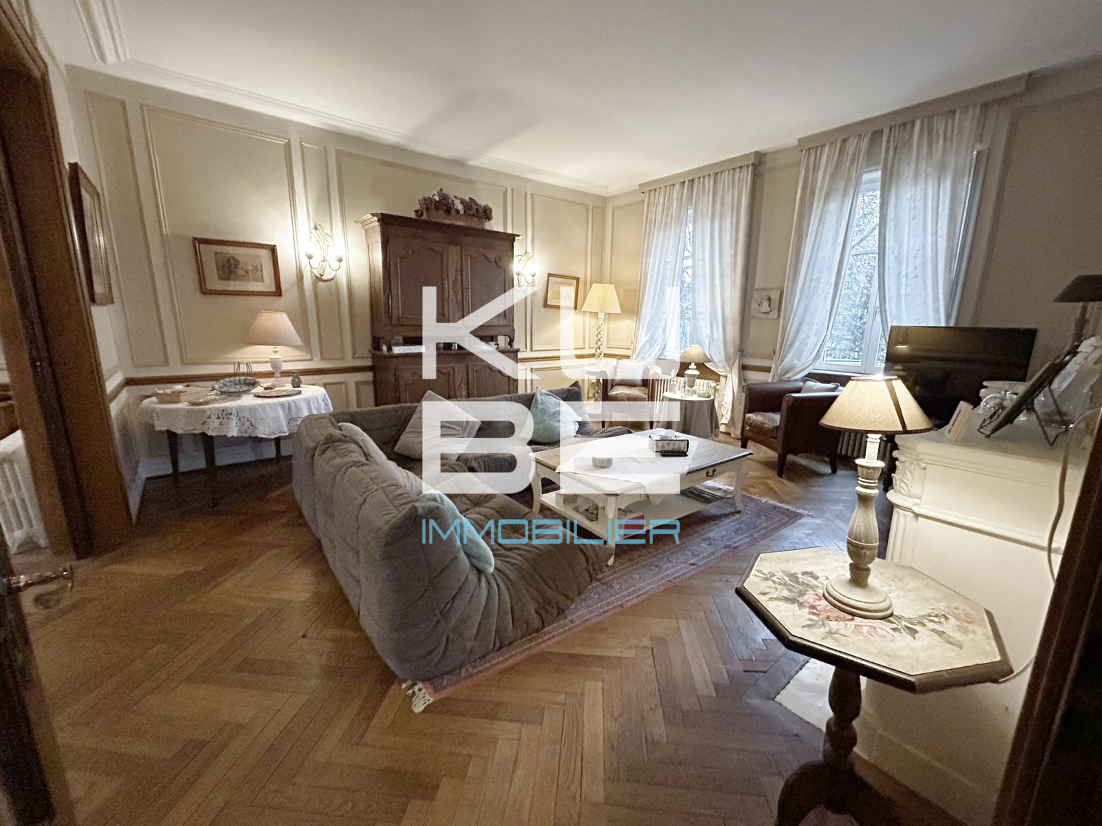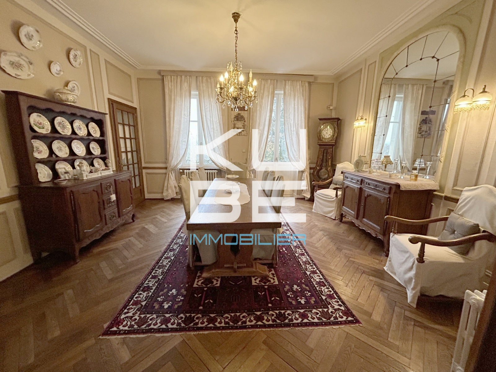 La décoration soignée — moulures, hautes fenêtres, grands rideaux — met en valeur tout le charme de cette demeure.