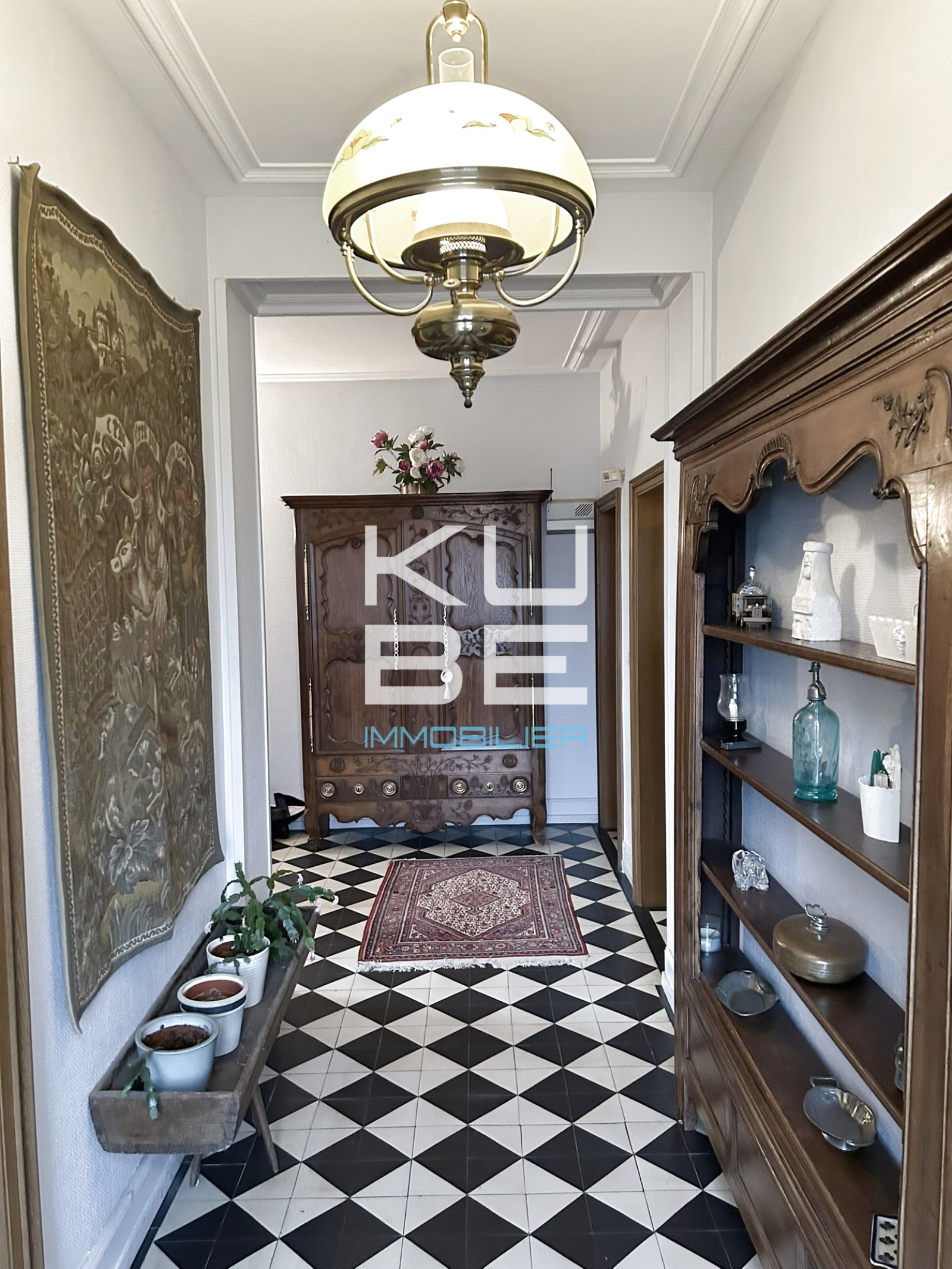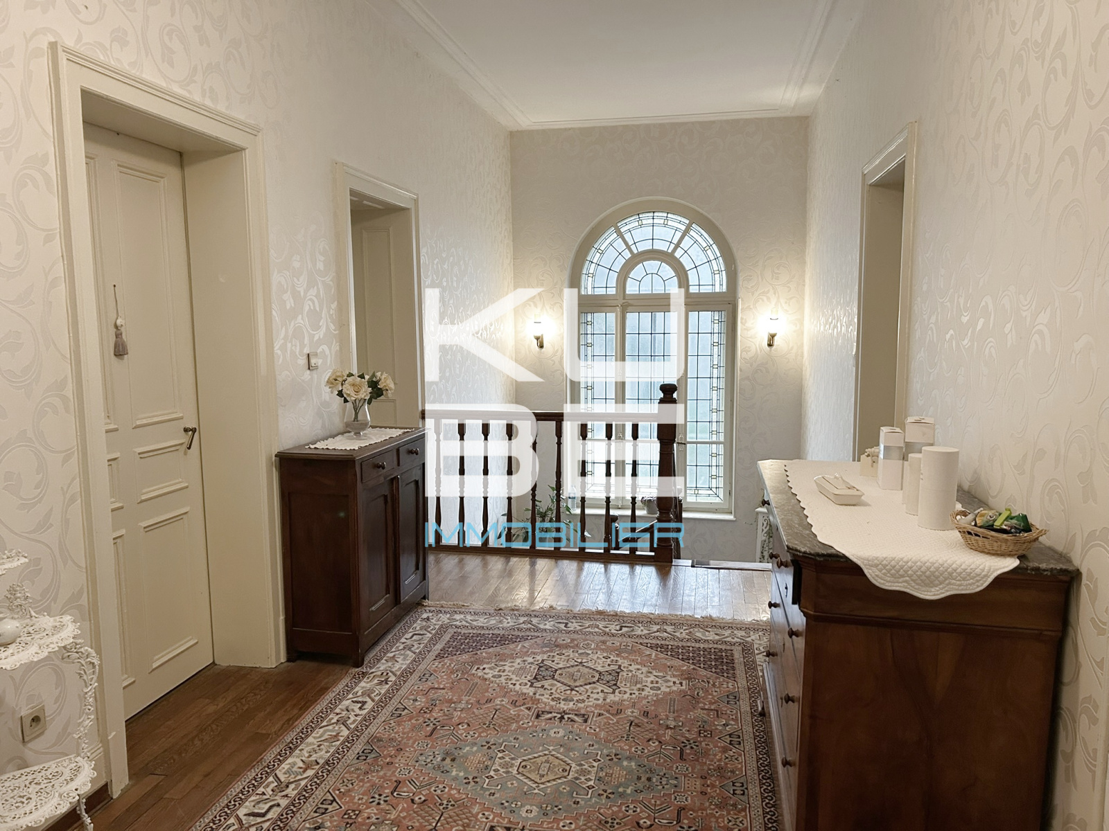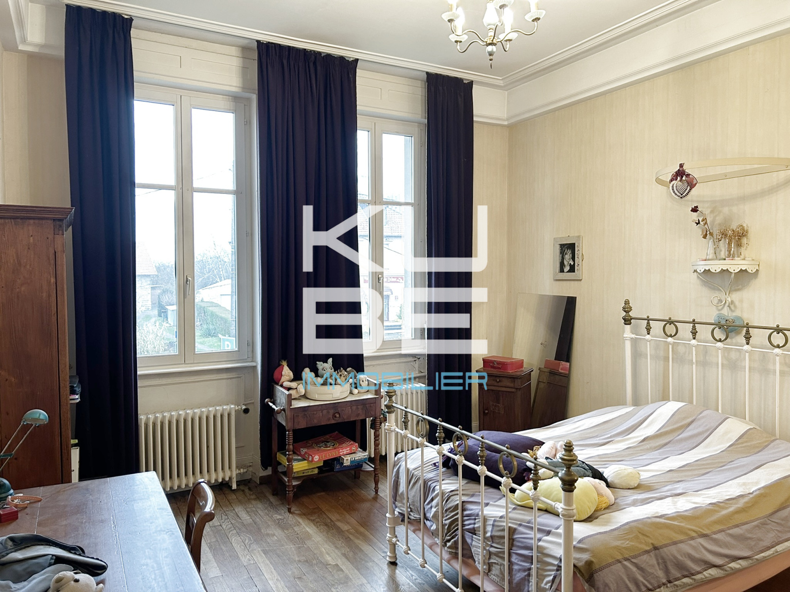 La décoration soignée — moulures, hautes fenêtres, grands rideaux — met en valeur tout le charme de cette demeure.