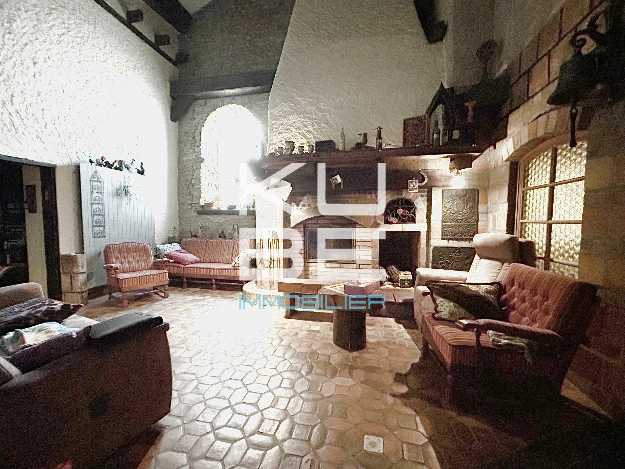 Un salon de 25 m² avec sa cheminée centrale traversante sur deux niveaux, apportant chaleur et caractère,