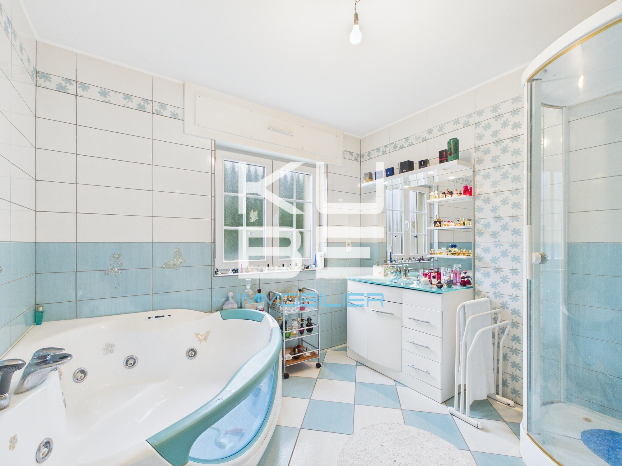 Salle de bains avec baignoire d’angle balnéo, cabine de douche et meuble vasque (8,7 m²)
